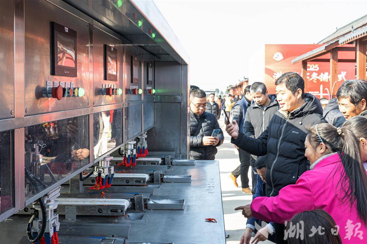 12月26日,在潜江市龙湾镇郑家湖“四季虾”养殖基地举行的湖北“潜江龙虾”冬捕活动上,一台能自动剥小龙虾的机器吸引了围观者。它是湖北瑞丰智控设备制造有限公司研发的一款抓虾机器人,通过机械臂精准捕捉小龙虾,AI视觉识别,仿生手旋转分离。整个过程仅需1.7秒。如今,机器人的成品率已达到98%,超越了熟练工人的水平。一台设备可替代约18名工人,大幅降低综合成本,提高产品新鲜度和质量稳定性。 (湖北日报全媒体记者 任勇 摄)12月26日,在湖北“潜江龙虾”冬捕活动区,一台能自动剥小龙虾的机器吸引了围观者。 (湖北日报全媒体记者 任勇 摄)